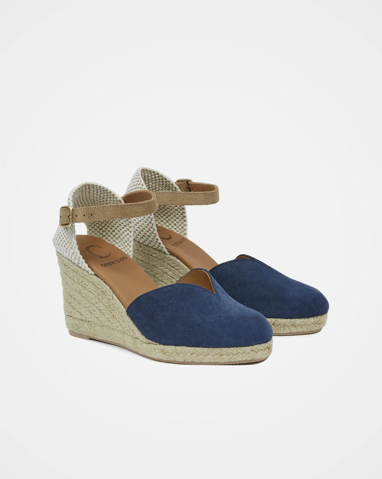 Step out in style with our Ankle Strap Wedge Espadrille. This elegant wedge heel espadrille shoe is perfect for dressing up or down. The plaited jute finish around the sole and heel is complemented by a rubber outsole. Featuring an enclosed toe with curved notched detail, comprised of suede and lined in vegetable-tanned leather .The back strap is comprised of a typical woven espadrille heel panel and a suede ankle strap, fastened with a metal buckle.