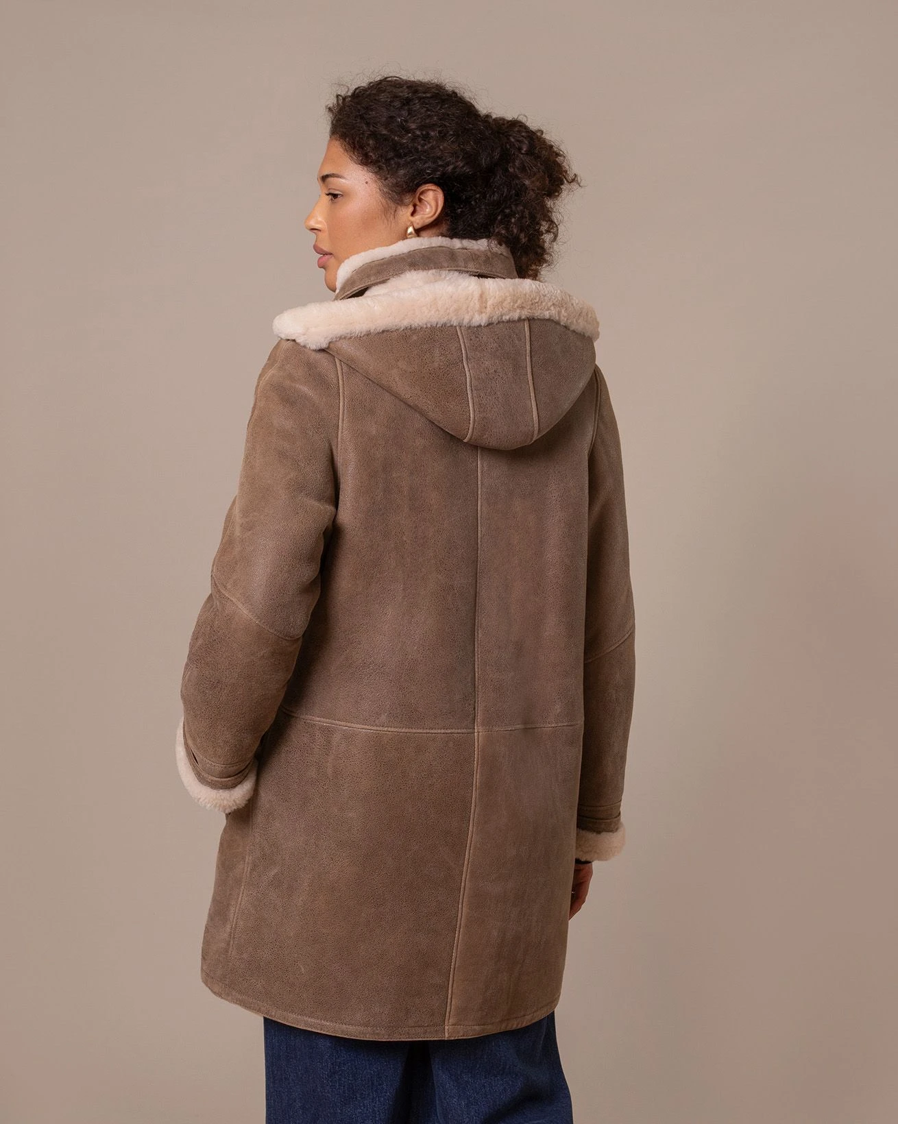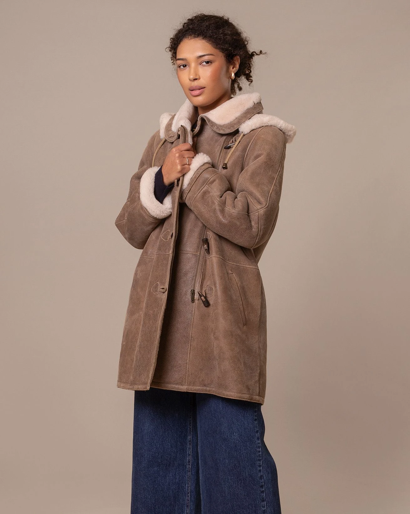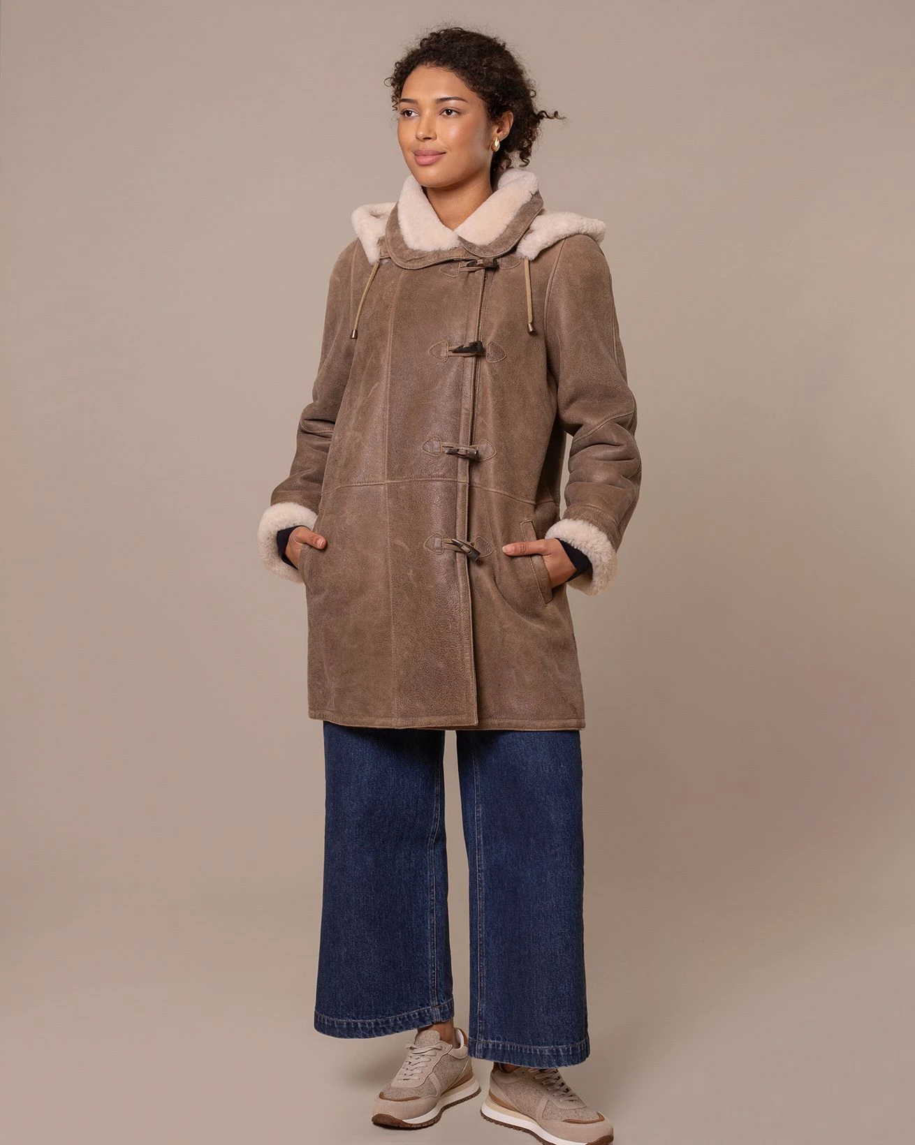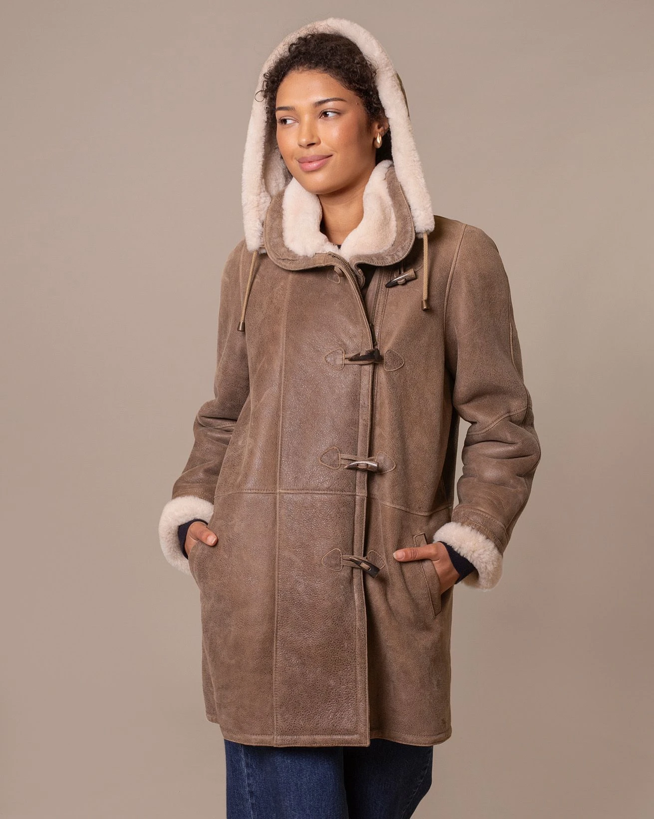 Invest in this beautifully made take on the classic duffle coat, crafted in 100% shearling and topped with a roomy hood that can be easily buttoned off if you don’t need it.