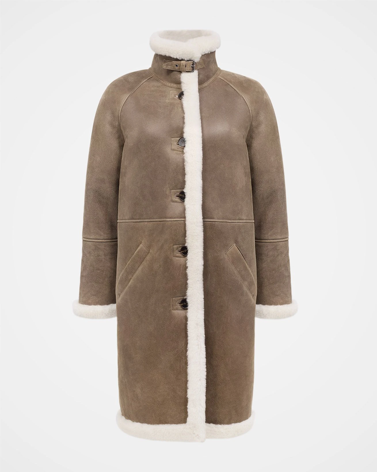 Invest in timeless style with our Classic shearling Overcoat. Featuring a collared neckline that can be fastened into a cosy funnel neck using a strap and buckle fastening, it boasts a comfortable boxy fit and convenient side pockets. Secured with horn buttons through the body, it’s a refined choice for any wardrobe.
