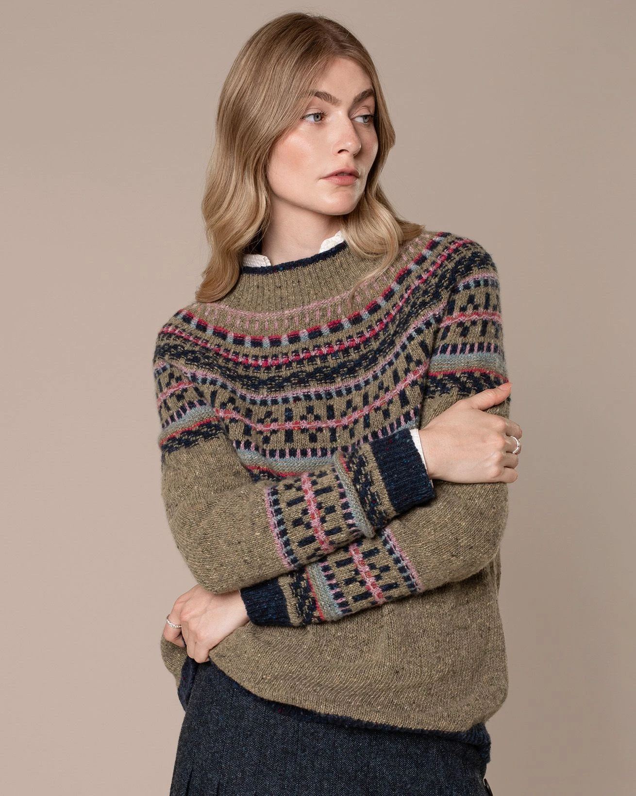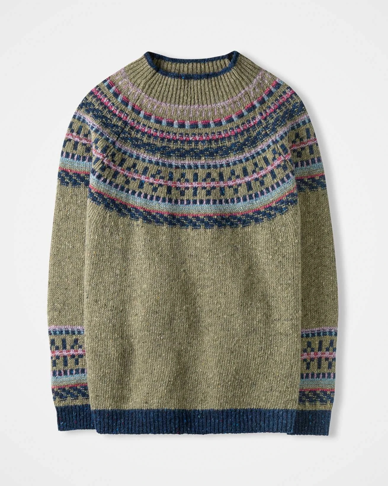 This crew neckline sweater boasts a boxy fit, highlighted by a beautifully crafted Fair Isle patterned stitched yoke detail. It combines traditional craftsmanship with modern comfort, making it a timeless addition to your knitwear collection.