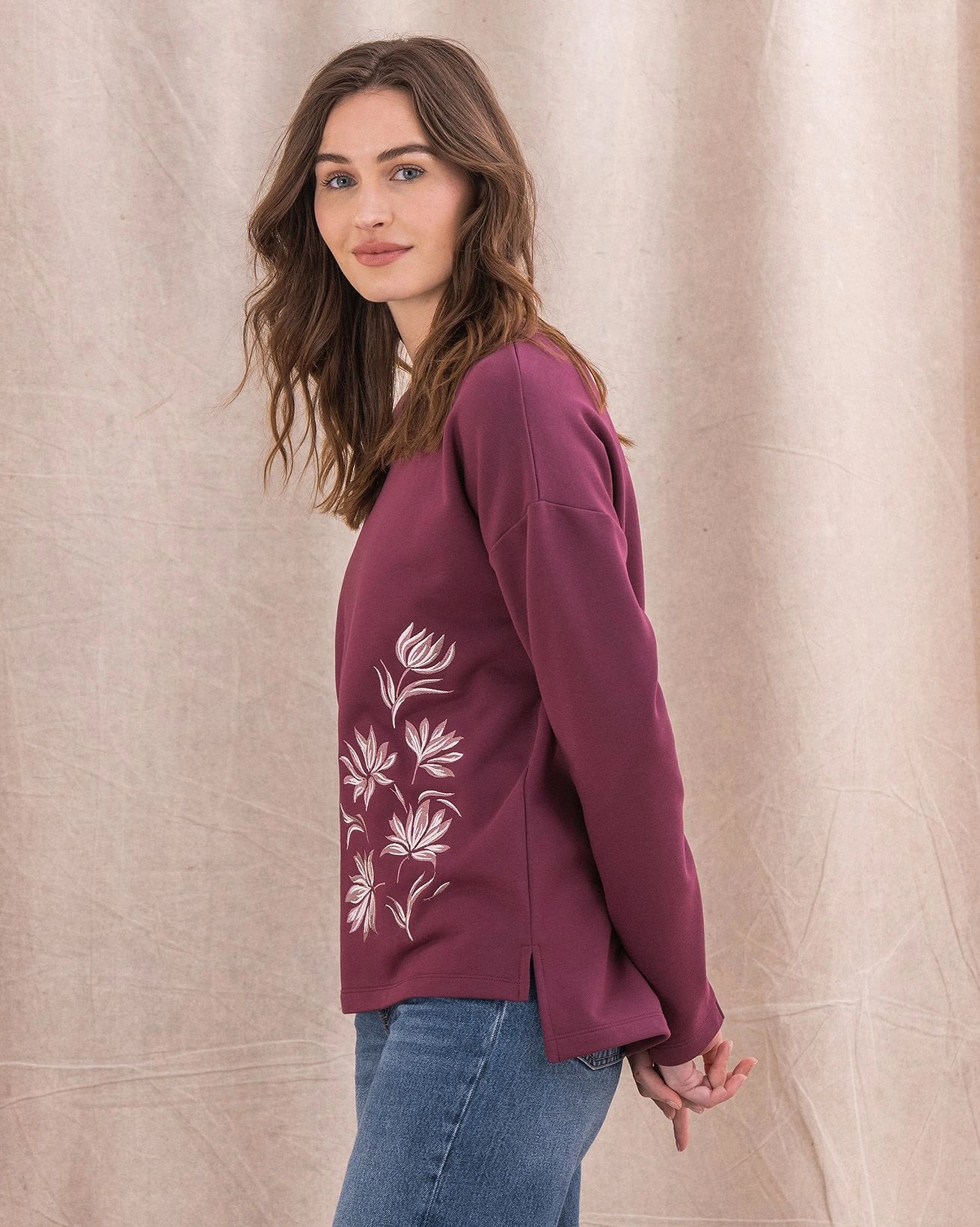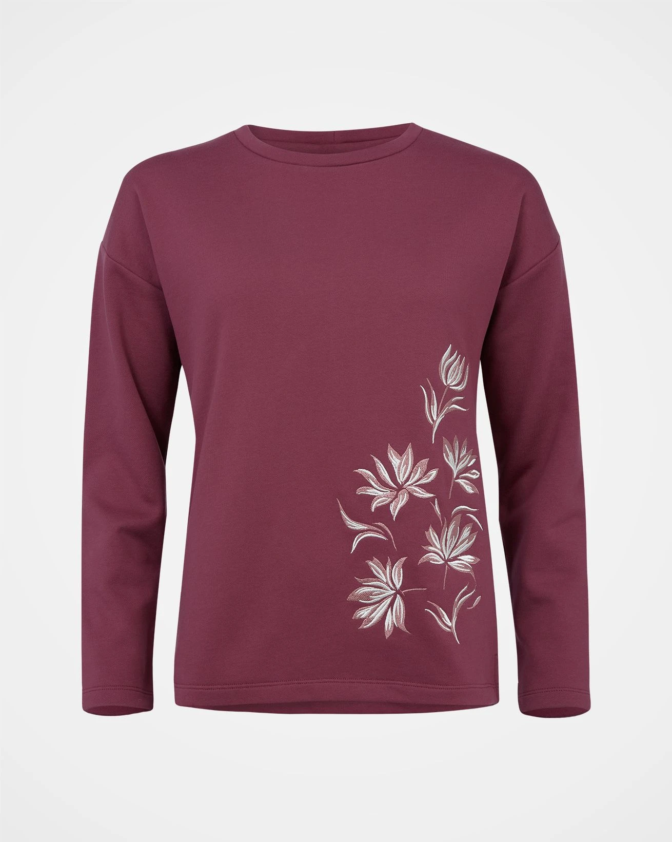 With feature floral embroidery, this boxy sweatshirt is incredibly easy to wear. With clean straight cuffs and a hem that is split and stepped, it hangs straight and is flattering over the hips. Details include a crew neckline and long sleeves. Wear every day or dress it up in the evenings with accessories and heeled boots.