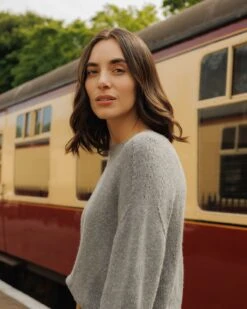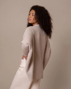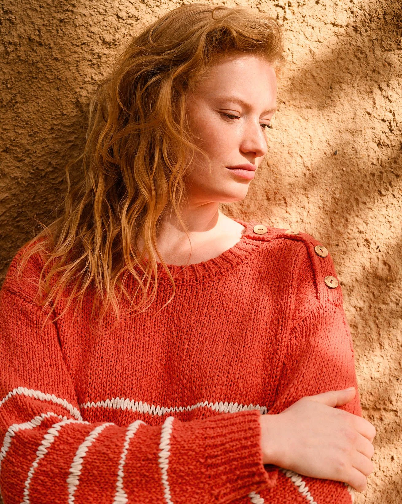 Crafted in slub yarns with a chunky, uneven structure created through random drop stitches, it’s trimmed with functioning buttons at the left shoulder for a little extra detail.