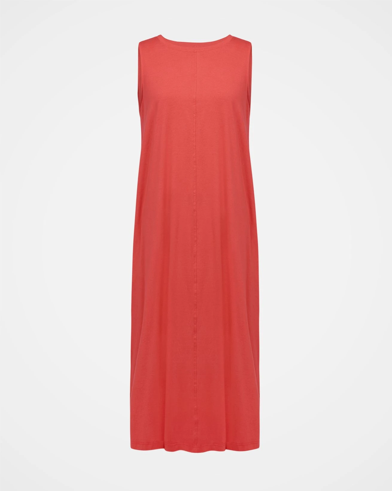 This sleeveless midi dress features side pockets, a back yoke seam and a centre back pleat to create a flattering fit that skims the body. The relaxed, soft fabric and effortless style of this dress makes it easy to style in many ways. Dress up with wedges and accessories for evenings or go for a more casual look with trainers or sandals for beach days.