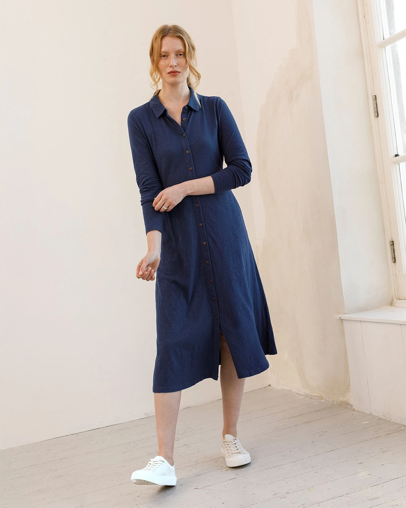 This collared shirt dress features a neat fit and midi length, offering a refined yet relaxed silhouette. With coconut buttons adding a natural touch, it’s a versatile piece that transitions effortlessly from day to evening.