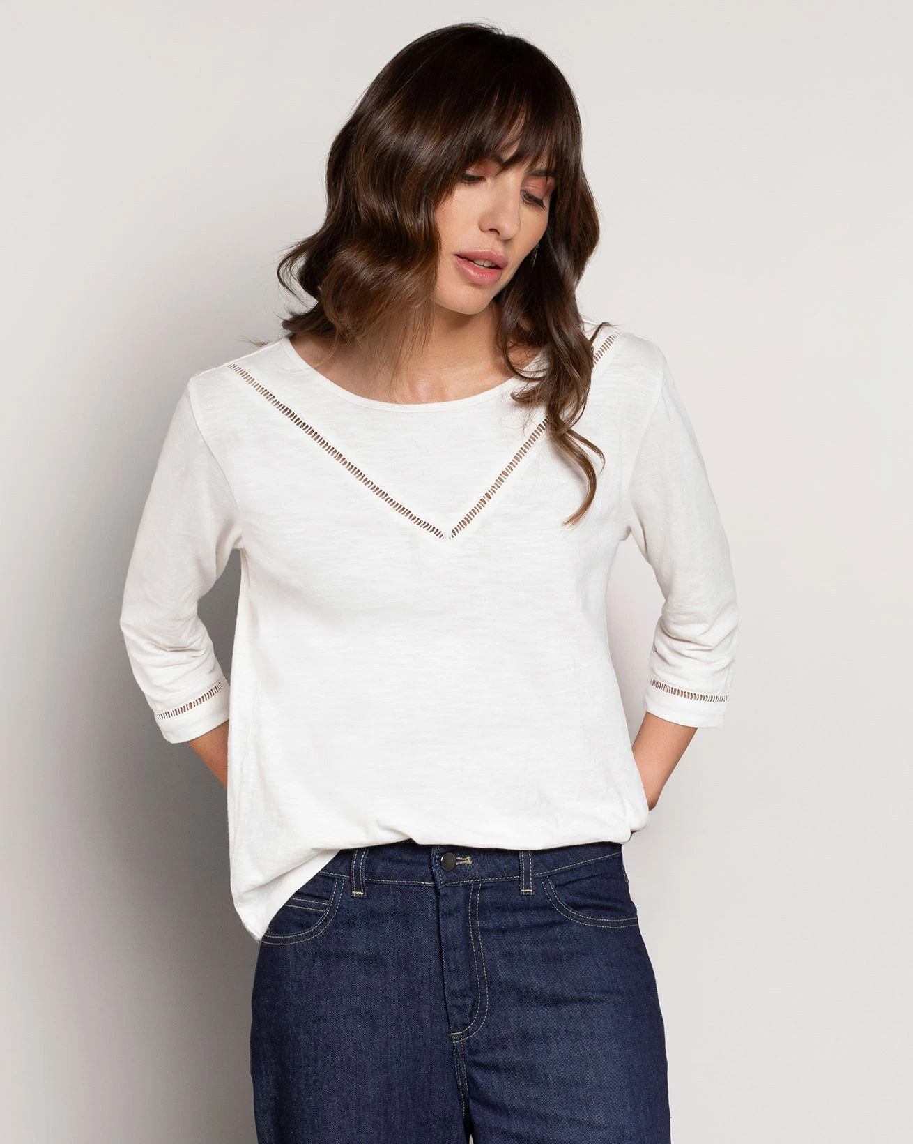 This boat neckline top features a straight fit with 3/4 length sleeves, enhanced by a stylish ladder trim detail. Crafted for comfort, it’s a versatile piece that adds a touch of sophistication to any casual outfit.
