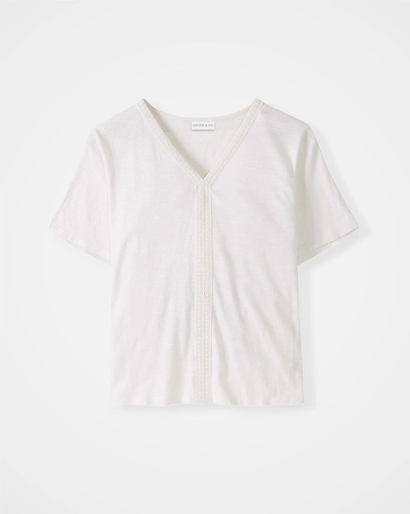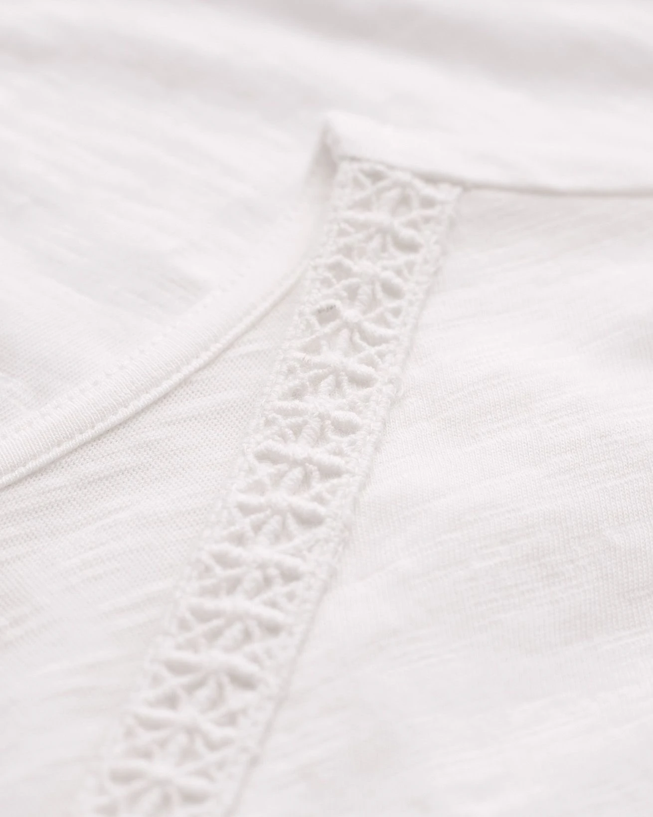 With a soft V neckline and straight fit, this top is accented by delicate cotton lace trim. The slub jersey adds a hint of texture, complemented by grown-on sleeves for an effortless, relaxed look.