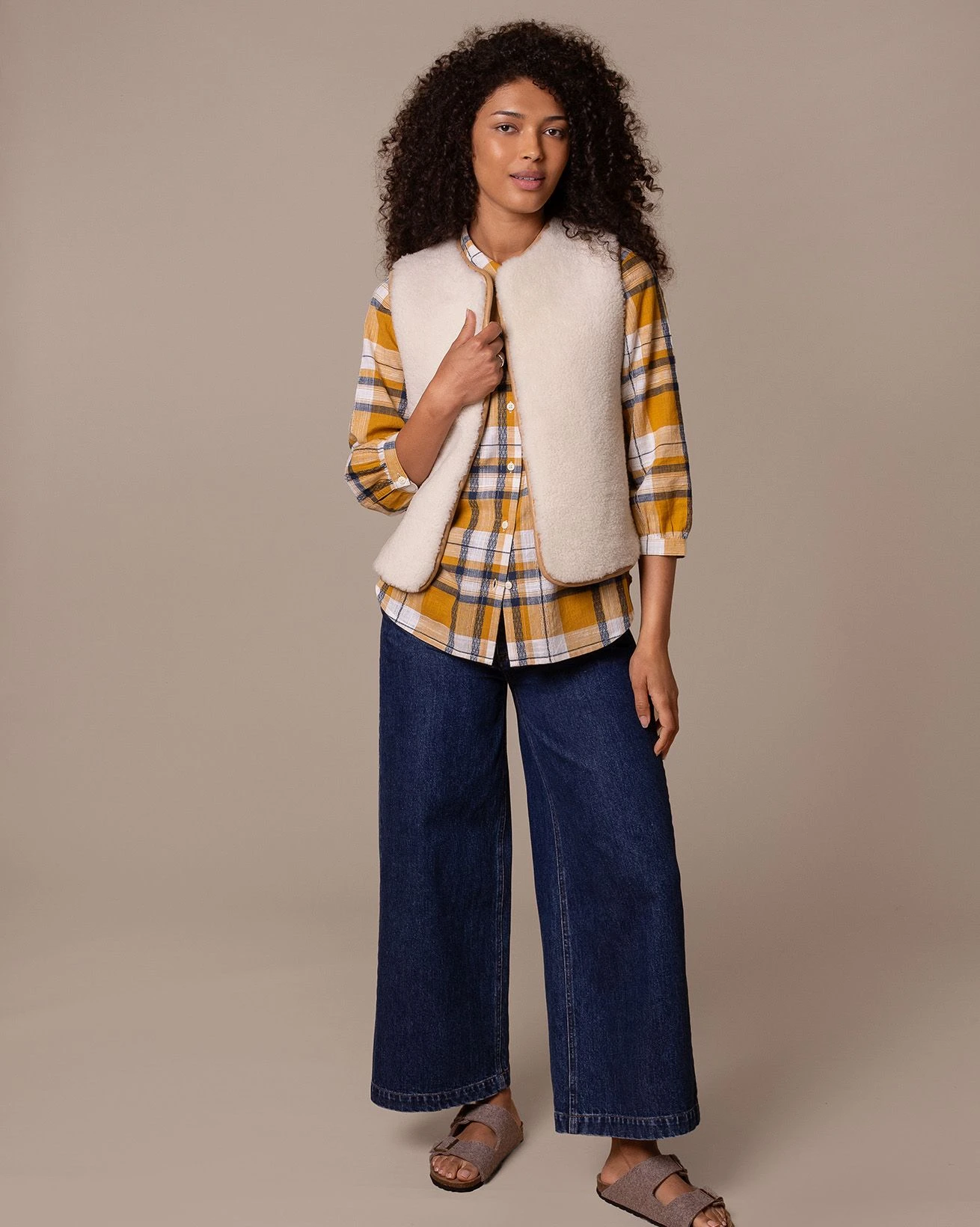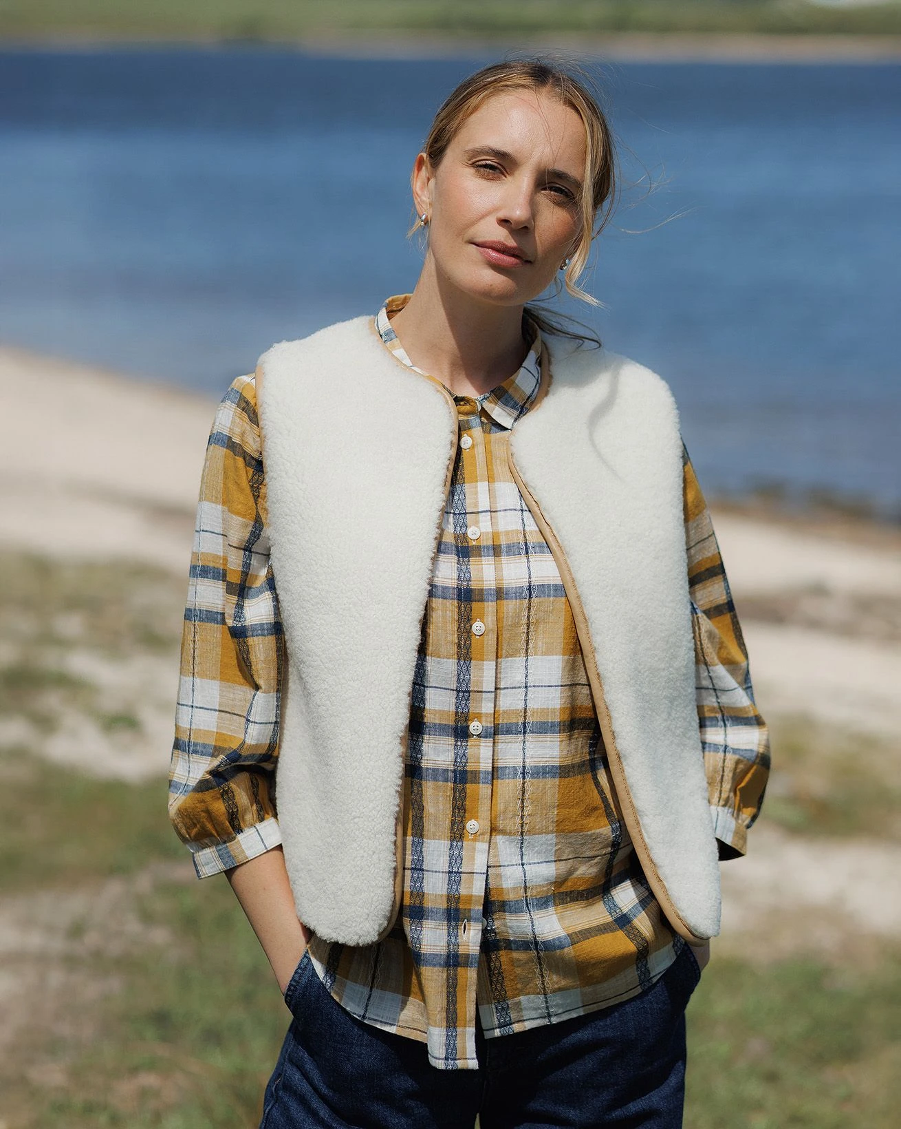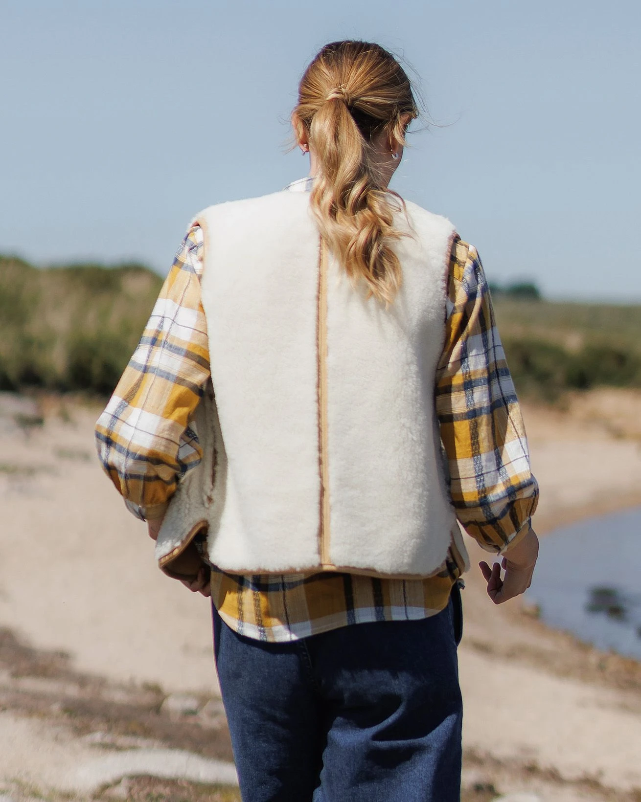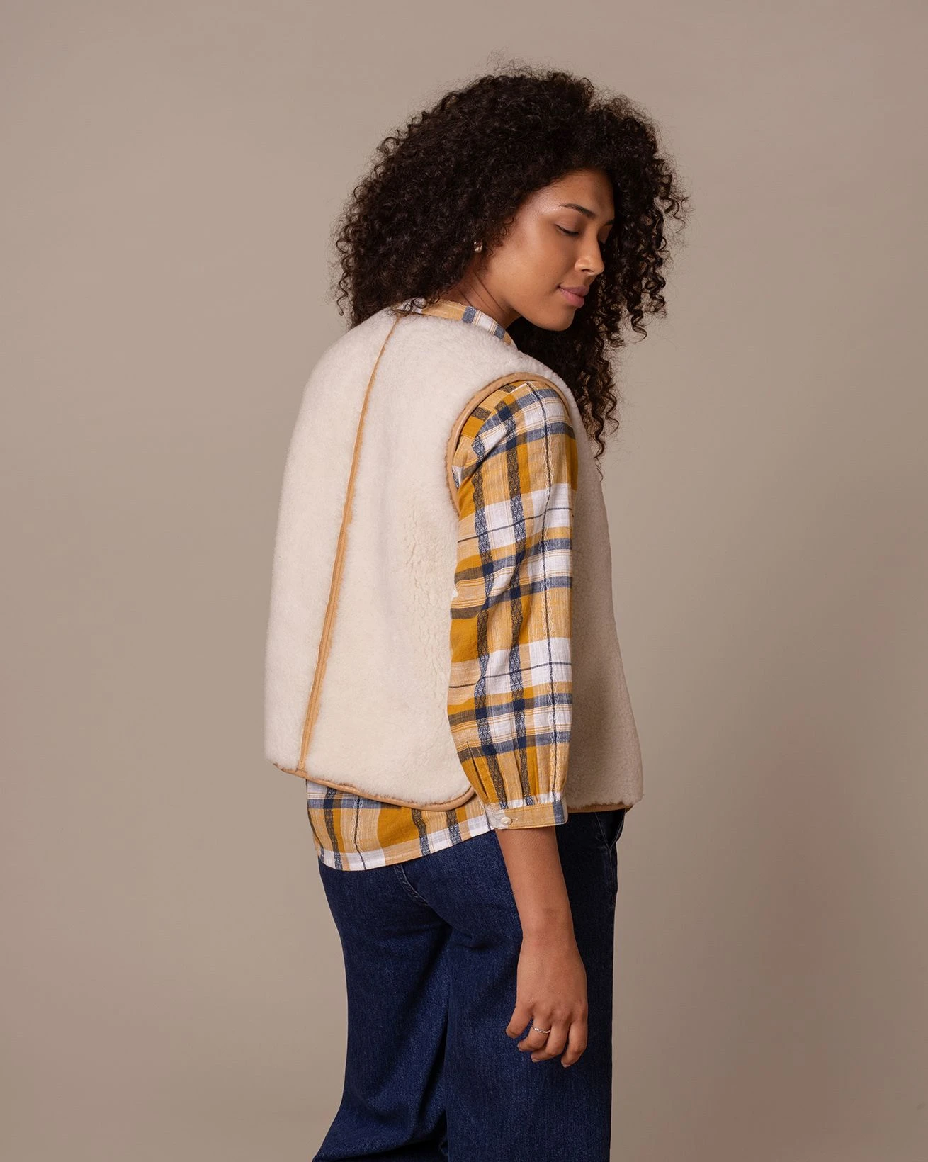 Made in Britain from pure shearling, this edge-to-edge gilet is fully reversible, offering a curly wool finish on one side and soft suede on the other. Designed with a collarless neckline and trimmed with leather binding for a refined finish.
