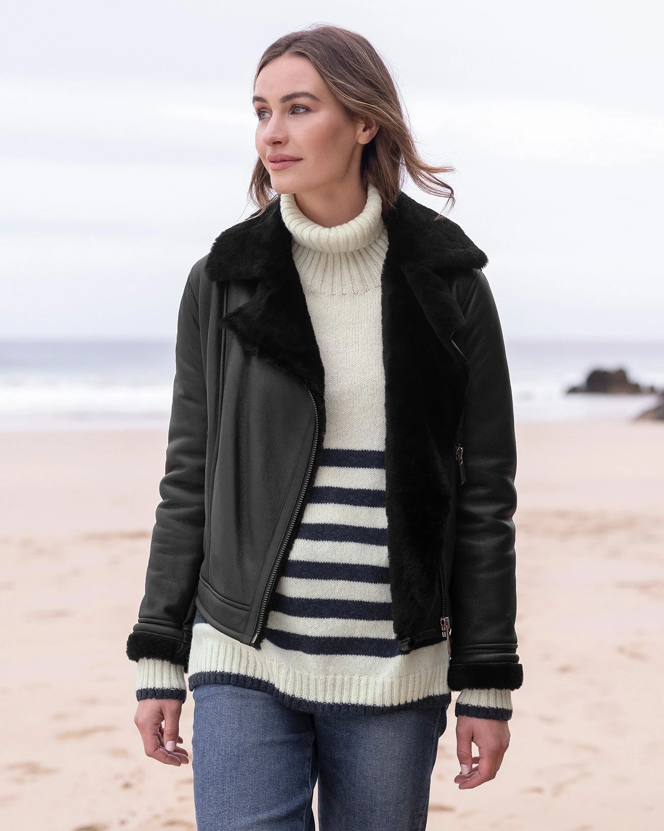 Crafted in rich shearling with a nappa finish at the outer, it features cloud-soft wool at the interior that’s revealed on the adjustable collar.