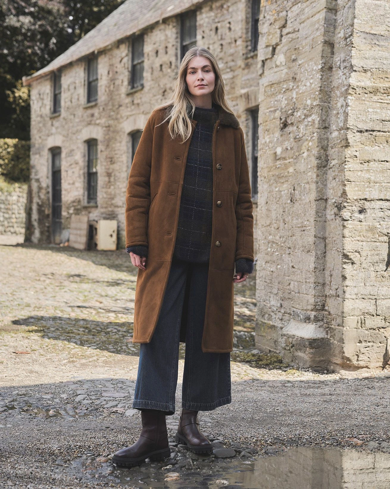 Made in Britain from sheepskin, this long coat features a collared neckline and three-quarter length sleeves. Finished with horn buttons, it combines natural warmth with classic detailing.