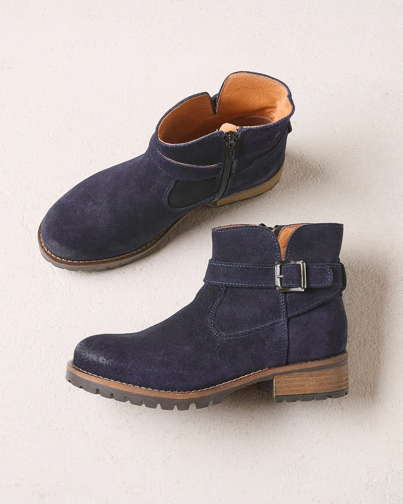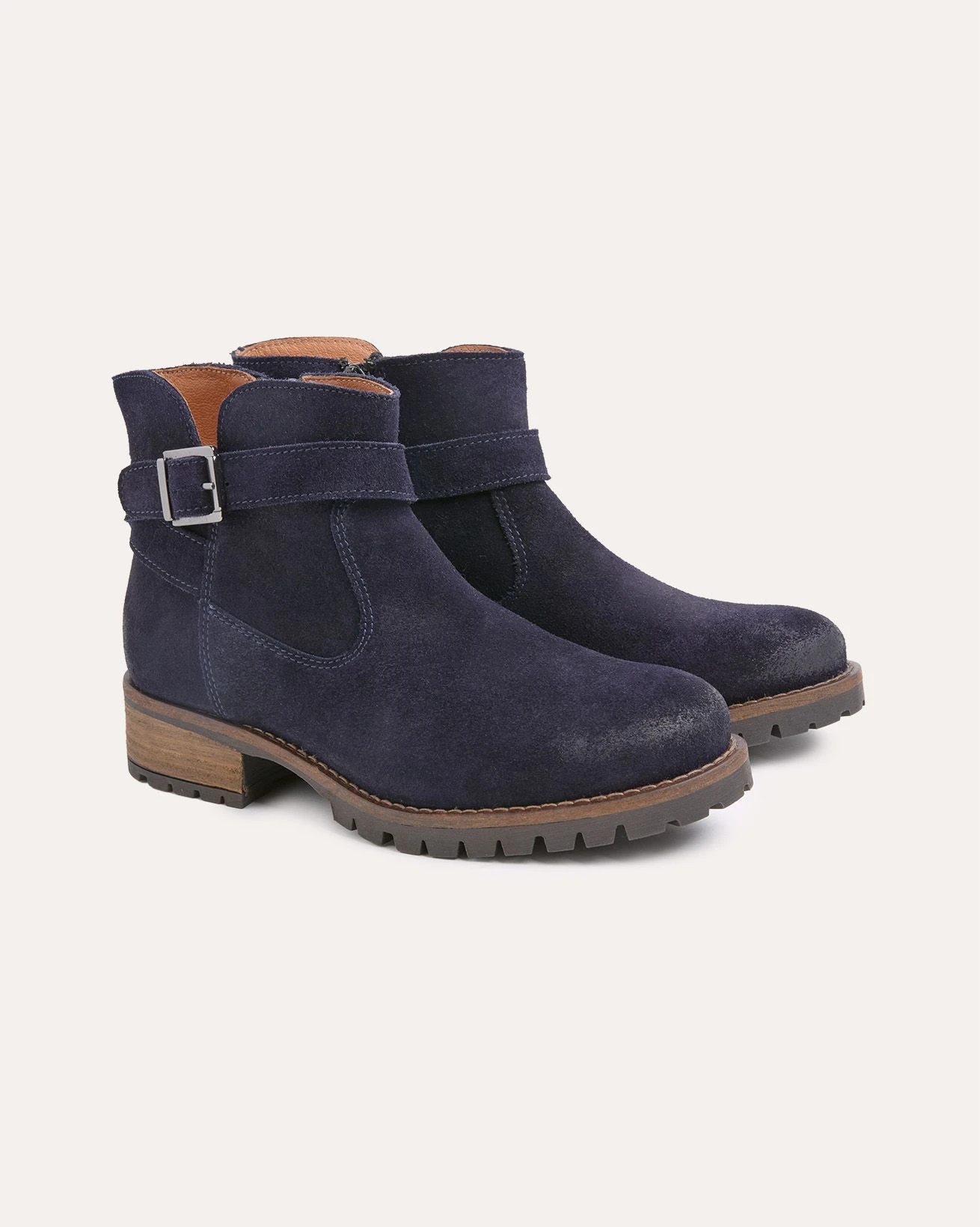 This ankle boot boasts a suede upper with a strap detail that elegantly wraps around the ankle area and fastens with a metal buckle on the outer side. Featuring a zip on the inside of the boot for ease of wear, making it a convenient choice for everyday use. The suede upper boasts a hand-burnished finish across the toe and heel for added character. The sole of the boot is not only stylish but also offers a secure grip with its cleated tread and low block heel, featuring a leather-inserted detail.