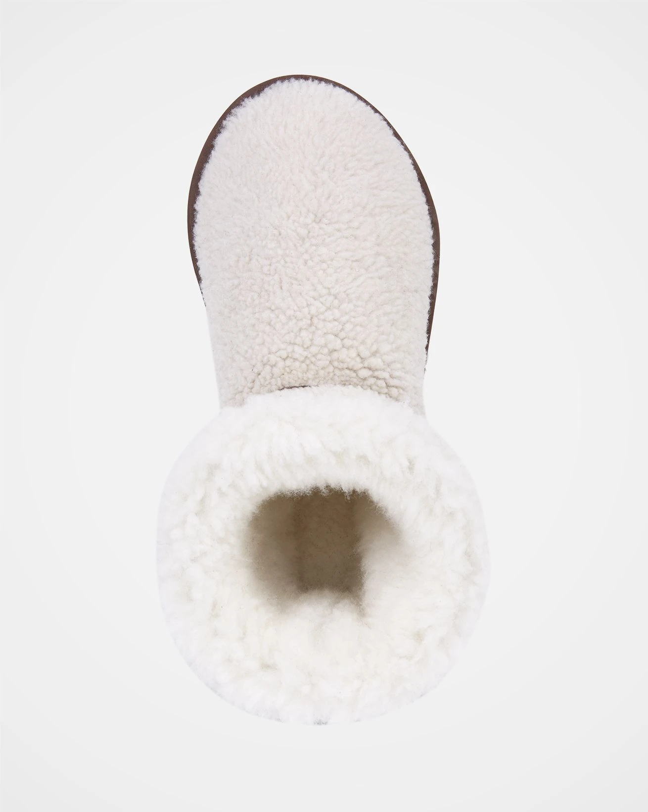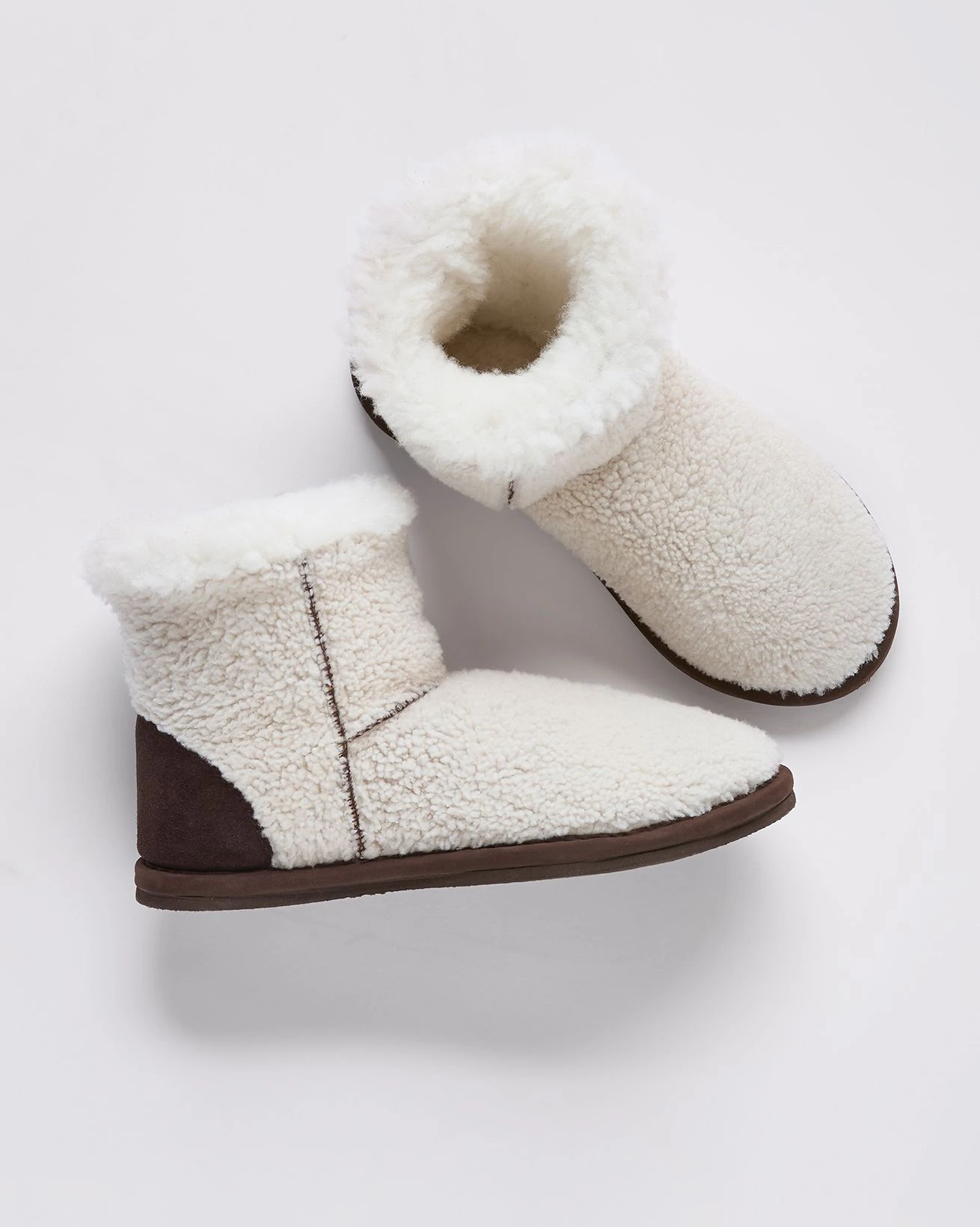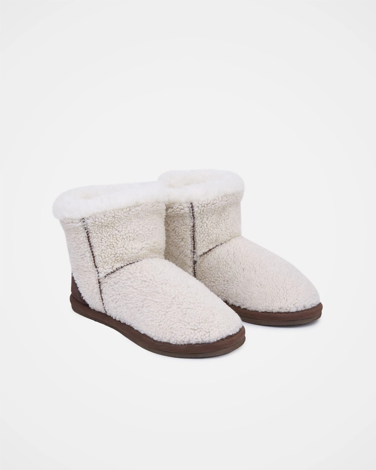 The teddy shearling shortie is the latest addition to our house boot collection. Created in a shortie height with an indoor slipper sole, they are luxuriously soft with a curly merino outer and lined with curly shearling. Details include a contrast suede heel panel and contrast binding on the seams. These boots are incredibly cosy for lounging around at home.