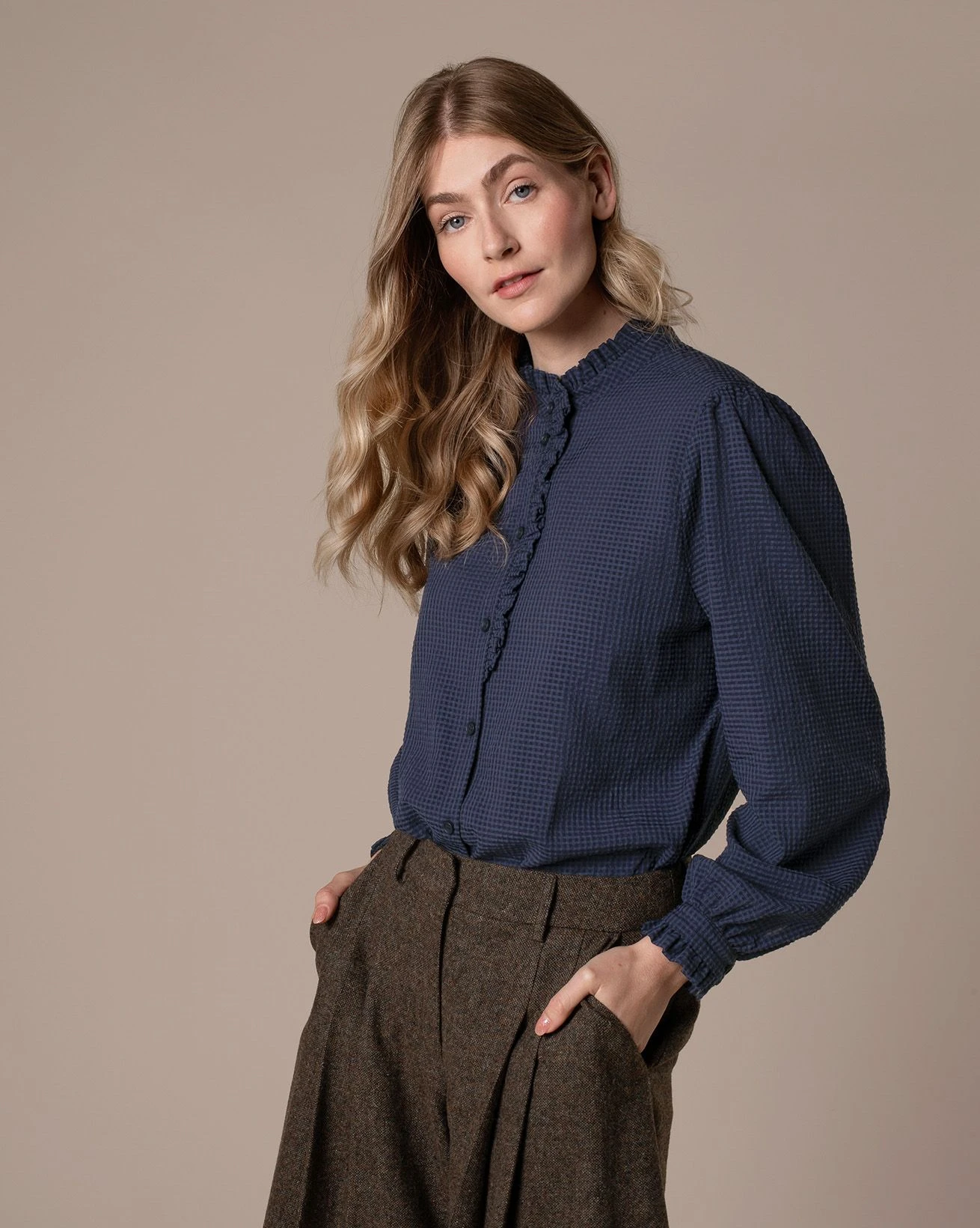 This luxurious blouse features a stand collar neckline with a delicate frill edge. Further frill trim adorns the cuffs, and the blouse is finished with Corozo buttons.