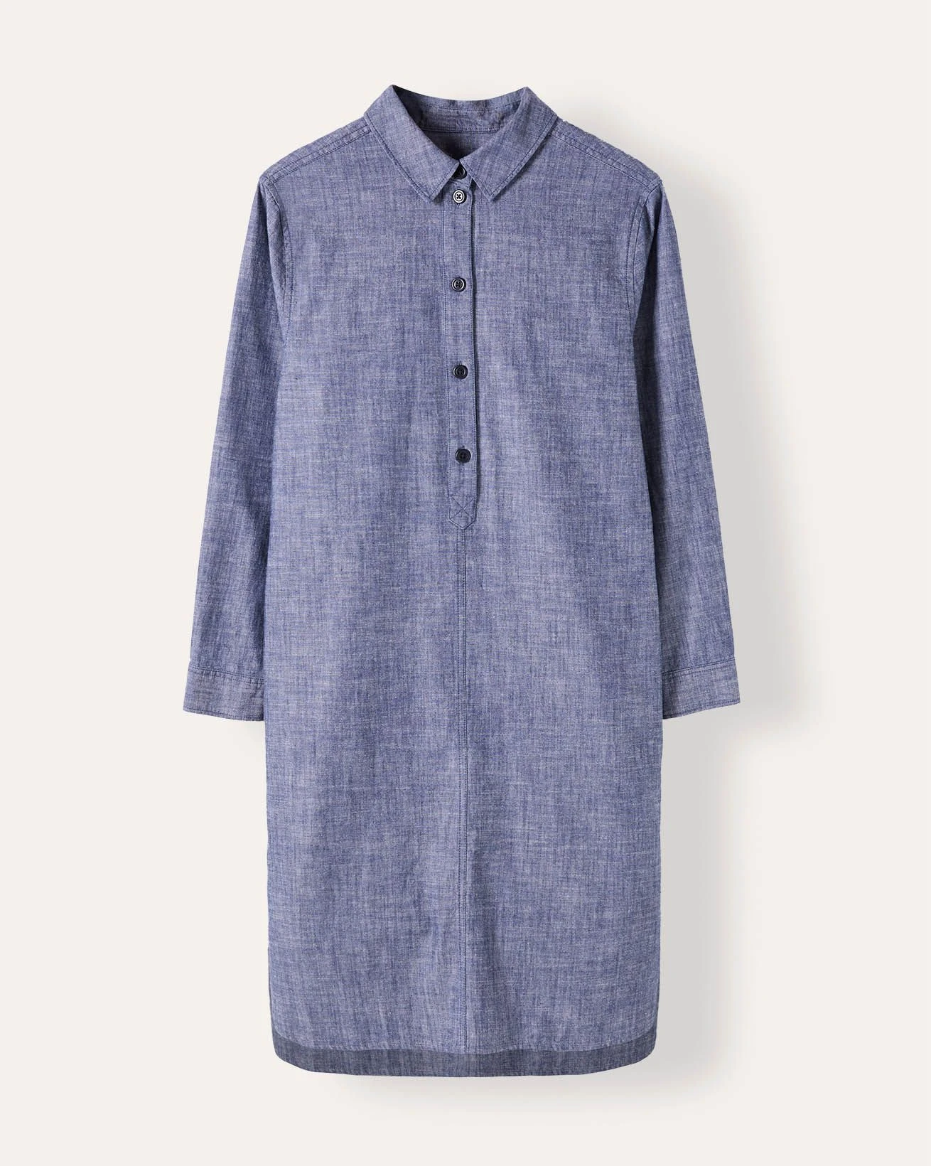 Made from cotton chambray, this knee-length dress features a shirt collar neckline and a half placket with corozo buttons. The indigo-dyed fabric is garment washed for a soft, lived-in feel, offering an easy everyday option with a clean finish.