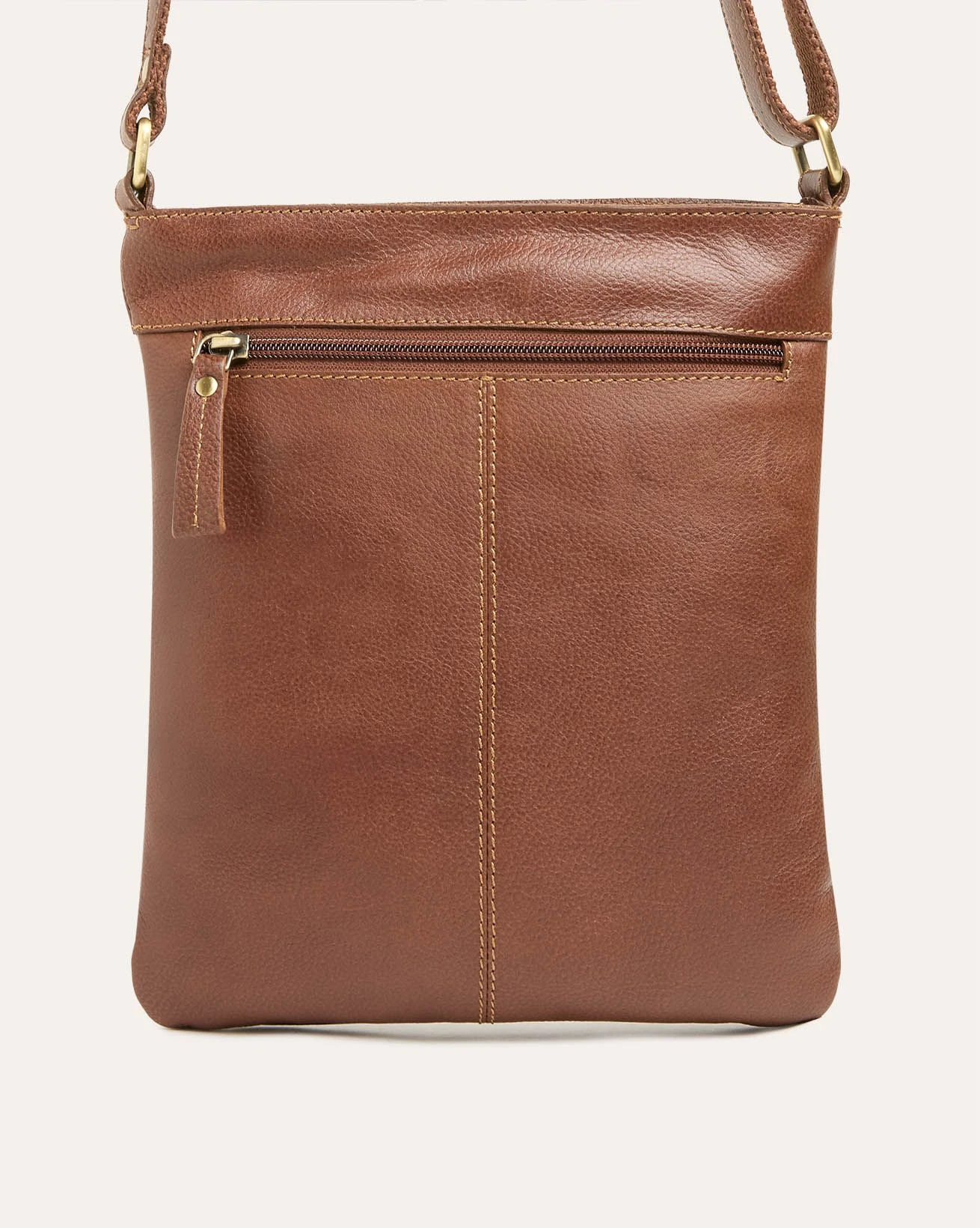 A compact cross body bag, crafted from Cow Leather, presents a rectangle shape with a zipped main compartment and front and back pockets. It includes an adjustable shoulder strap and internal compartments, including a zipped pocket.
